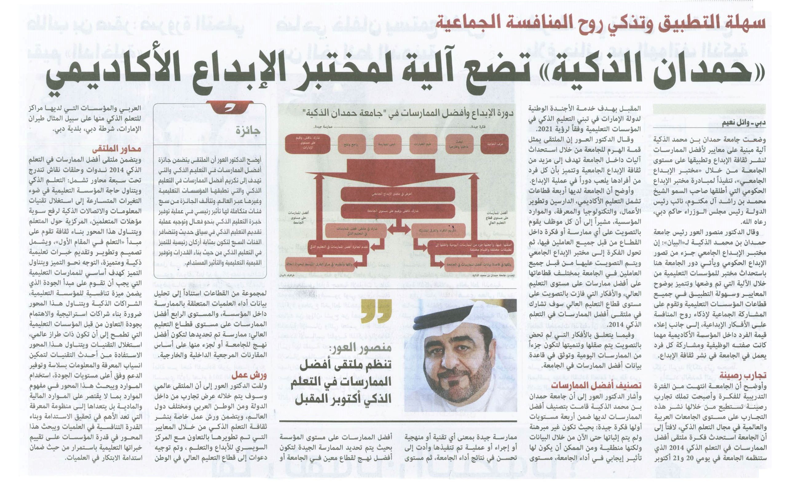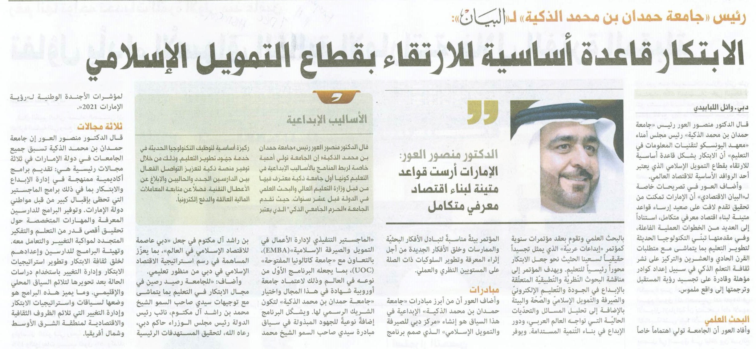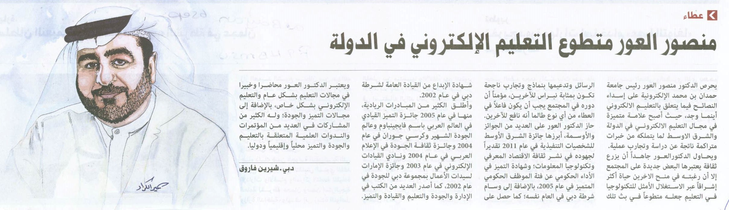 جامعة حمدان بن محمد الذكية تعيد تصميم مفهوم التعليم في دول مجلس التعاون الخليجي /منطقة الشرق الأوسط وشمال إفريقيا منصور العور: جهود استثنائية لموظفي «حمدان الذكية» أثناء جائحة «كوفيد 19» منصور العور رئيس الجامعة لـ« البيان»: 5 مواصفات إبداعية لخريجي «حمدان الذكية» «التعلم باللعب» تعدّ أجيالاً من صناع المستقبل «المعلم الأوبر» مستقبل التعليم العالي جامعة «حمدان الذكية» تحصد شهادة «ويل» للصحة والسلامة سيف بن زايد يكرّم العور تقديراً لدوره في «جائزة وزير الداخلية للتميّز» منصور العور رئيس «جامعة حمدان الذكية» لـ«الاتحاد»: «نخلة زايد» أول منصة سحابية توفر خدمات التحوّل الذكي للجامعات التقليدية «حمدان الذكية» الأولى إقليمياً بالتحول لـ«أمازون ويب سيرفيسز» رئيس الجامعة لـ«البيان»: 98500 معلم أهلتهم «حمدان الذكية» على «التعليم عن بعد» منصور العور: «حمدان الذكية» تعيد هندسة خارطة التعليم العالي عربياً وعالمياً منصور العور لـ«البيان »: «حمدان الذكية» تعدّ 3 مجموعات بحثية حول تأثيرات «كورونا» لا تعبد الكرسي لبيك وطني الإمارات تعلم (2-2) الإمارات تُعلِّم (1-2) منصور العور لـ « البيان»: برامج جامعة حمدان عبر الوسائط الذكية بحلول 2020 خلال «المؤتمر العالمي للتعلّم الإلكتروني» في كندا الكفاءات الرقمية أيقونة نجاح الذكاء الاصطنـاعي منصور العور لـ«البيان»: «حمدان الذكية» أول جهة تطبق «X10» «جامعة حمدان الذكية» تطرح مشروعاً دولياً لتعليم اللاجئين بأساليب إبداعية منصور العور: المتعة سبيل إبداع الدكتور منصور: هدفنا خدمة التطلعات الطموحة في الوصول إلى مصاف الدول الأكثر ابتكاراً في العالم بحلول العام 2021. التعليم الذكي يواكب طموحات الأجندة الوطنية رئيس جامعة حمدان بن محمد الذكية يؤكد ضرورة إنتاج منظومة شاملة من المعايير الحديثة لتطوير العملية التعليمية. منصور العور: الارتقاء بالتعليم يتطلب مواكبة التطور التقني الدكتور منصور العور للبيان: 10 عناصر لتسريع إنجاز مستهدفات الأجندة الوطنية دوت اميريتس: خمسة مقومات تنقل التعليم من الأمية التقليدية مقابلة مع صحيفة البيان: خمسة مقومات تنقل التعليم من الأمية التقليدية المقابلة الصحفية التي أجريت معي خلال مشاركتي في مؤتمر إلوسيان لايف 2016 بدنفر بالولايات المتحدة مقابلة مع جريدة البيان عن إطلاق مركز ريادة الأعمال في الجامعة صحيفة الإمارات اليوم - وصية والدتي جعلتني رئيساً لجامعة حمدان بن محمد الذكية مقابلة مع مجلة .GOV - فبراير 2015 صحيفة البيان - "حمدان الذكية" تضع آلية لمختبر الإبداع الأكاديمي صحيفة البيان - الابتكار قاعدة أساسية للارتقاء بقطاع التمويل الإسلامي صحيفة البيان - منصور العور متطوع التعليم الإلكتروني في الدولة مقابلة عن محاضرتي عن الطاقة الإيجابية في مؤسسة دبي للإعلام - يناير 2015